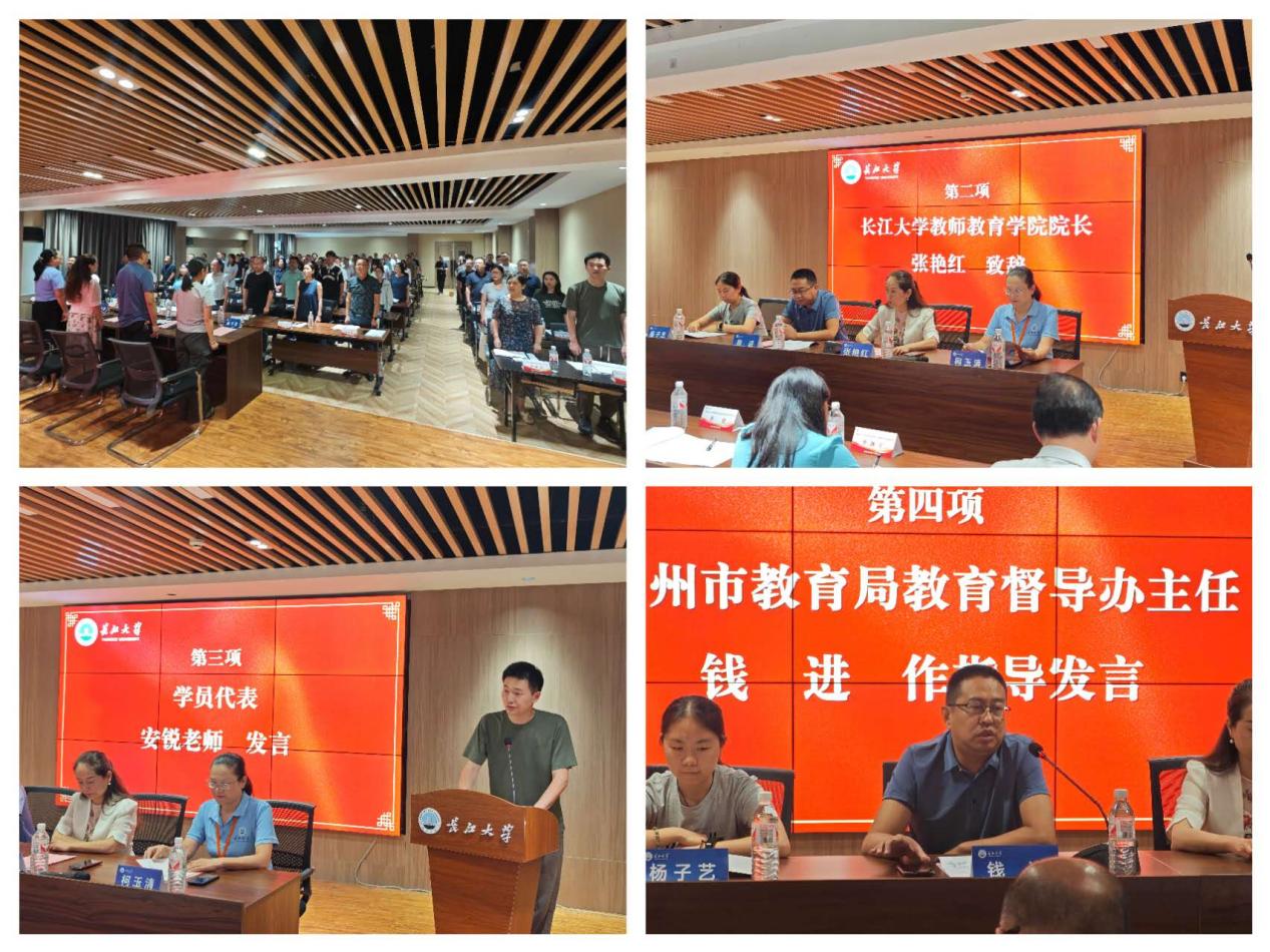 8月14日上午,参训学员陆续完成报到工作,蓄势待发。下午2时,开班仪式在庄严的国歌声中正式拉开帷幕。仪式由长江大学教育与体育学院办公室主任刘海兵主持。长江大学教师教育学院院长张艳红在欢迎辞中强调,本次培训是贯彻落实国家教育政策、推动荆州教育现代化的重要举措,希望各位学员以“空杯心态”潜心学习,以“实干精神”践行使命。学员代表安锐老师在发言中表示,作为基层教育工作者,我们将珍惜这次宝贵的学习机会,将培训成果转化为推动县域教育发展的实际行动。荆州市教育局教育督导办主任钱进在讲话中要求全体学员“学深悟透政策、精准对标实践”,以督导评估为抓手,推动优质均衡与普惠发展落地见效。开班仪式结束后,全体参会人员合影留念,定格这一凝聚共识、携手奋进的时刻。