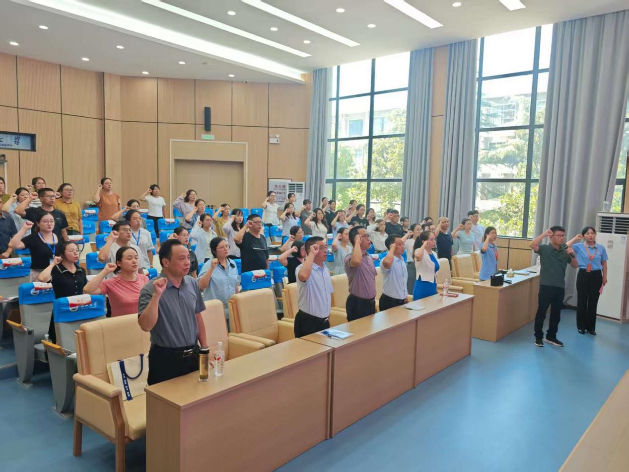 在领誓人向矛老师的带领下,全体参训教师重温教师誓词。教师们举起右手,庄严宣誓,重申教育初心与使命,表达了对教育事业的热爱和忠诚,以及为培养祖国下一代而奋斗的决心。仪式最后,全体人员合影留念,记录下这一重要时刻。